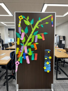最初はホワイトボードに笹の絵を書いて短冊だけ作ろうと思ったのですが、さすがクランの利用者さん、、、😥気づけば、画用紙で飾り付けまで作ってくださっていました~😭
