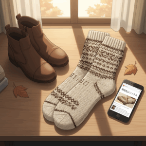 急な寒さを感じる時、意外と見落としがちなのが足元です。足元が冷えると体全体が冷えやすく、体調を崩す原因にもなりかねません。普段使いの靴下を、ウールや厚手のコットン素材の暖かいソックスに変えるだけでも、快適さがぐんとアップします。ブーツとの相性も抜群なので、ぜひお気に入りの一足を見つけてみてくださいね。